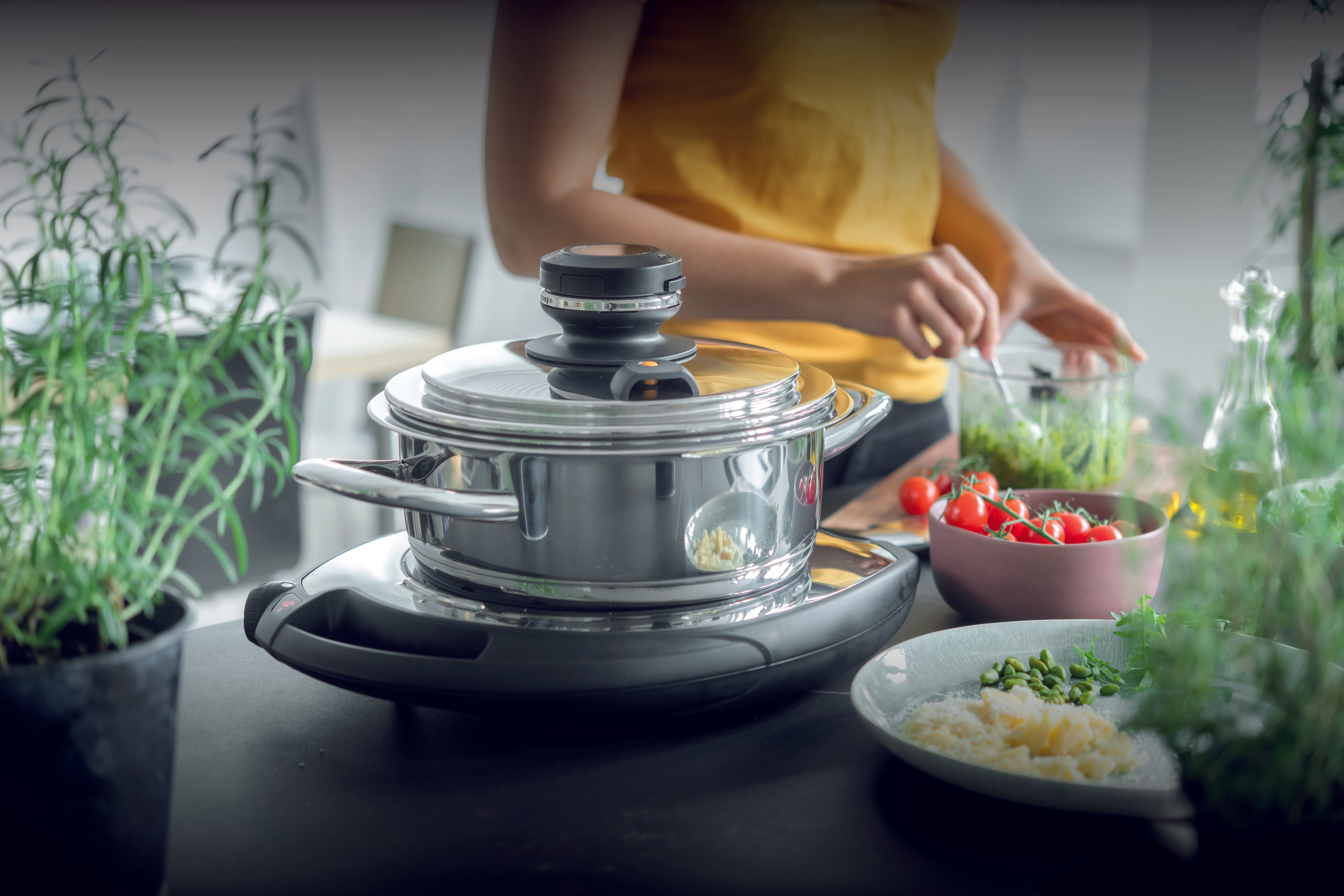 To omogućuje kuhanje bez dodatka vode: dno brzo upija toplinu, učinkovito je pohranjuje i ravnomjerno prenosi na hranu. Tijekom kuhanja stvara se zatvoreni ciklus između dna posude, ruba za hlađenje i poklopca, koji sprječava isparavanje pare i osigurava da se hrana kuha u vlastitom soku. Time se očuvaju hranjive tvari i prirodni okus jela.